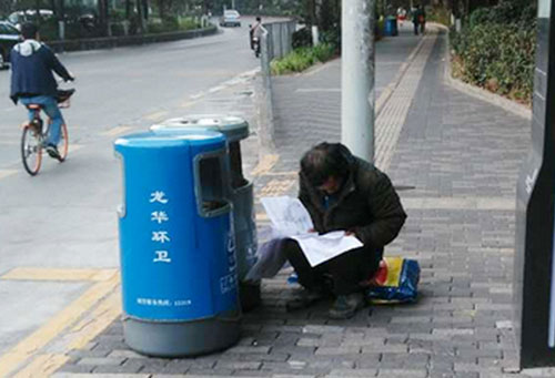 2月14日上午8時39分,網友高小姐報料稱,早上8時05分在深圳龍華大浪桃源賓館公交站旁,一位拾荒男子蹲在垃圾桶旁非常認真的在看一份小學數學卷子,讓準備去上班的高小姐肅然起敬。