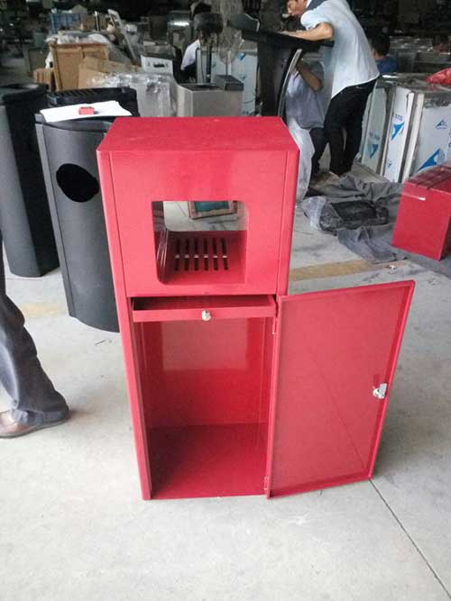 欣方圳為河源市源城區的一家大型商場,生產了一批個性化定制F289鋼制垃圾桶。欣方圳鋼制垃圾桶廠家設計制造的這款F289鋼制垃圾桶顏色為喜氣中國紅,中國紅是一種永遠不會過時的流行時尚色彩,它是一種穩重而不失大氣的色彩!欣方圳垃圾桶廠家生產的鋼制垃圾桶系列產品均采用優質冷軋鋼經除油-除銹-表調-磷化處理后,表面采用汽車靜電粉末噴漆工藝,噴塑粉主要有丙烯酸粉末、聚酯粉末等。雙層防銹,漆面色澤耐久。欣方圳垃圾桶廠家的F289鋼制垃圾桶堅固耐用,色澤多樣化,不易破損,是你獨一無二的選擇。