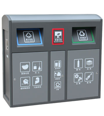 中山市政園林綠化工程定制的這款卡通風(fēng)格造型的戶外垃圾桶,紅、灰、藍(lán)三色分別用于有害垃圾、其他垃圾、可回收物垃圾分類收集使用,優(yōu)質(zhì)鍍鋅板金屬烤漆,帶宣傳欄平臺底座絲印“垃圾不落地,環(huán)境更美麗