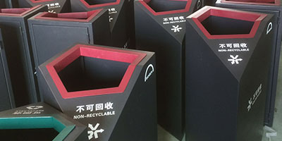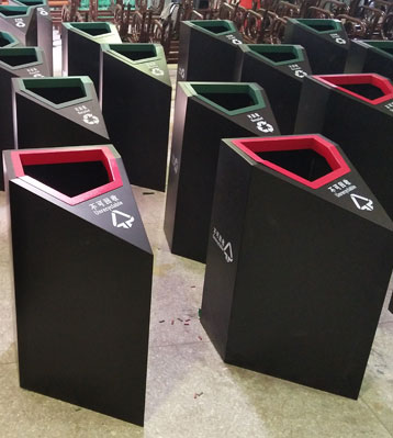 欣方圳鋼板噴塑分類垃圾桶表面經過除油、噴砂防銹處理后,再進行酸洗磷化處理;表面清理干燥后整體進行靜電噴涂或烤漆處理.。