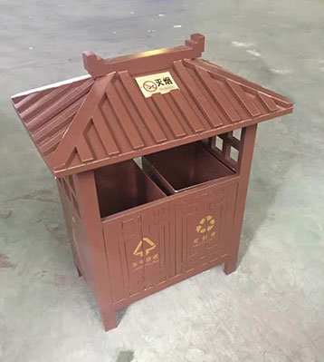 欣方圳景區仿古鋼制垃圾桶,桶頭部分屋檐造型,造型優美、古色古香。