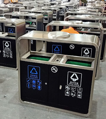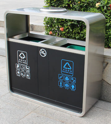 廣州市政戶外不銹鋼烤漆分類垃圾桶門板不銹鋼黑色烤漆更防銹,配置模壓玻璃鋼內桶,耐腐蝕不生銹適合長期戶外擺放經久耐用。