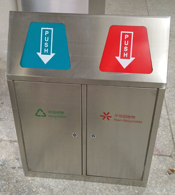 室內不銹鋼推蓋式果皮箱采用1.0mm優質201材質制作而成,桶身絲印可回收物和不可回收物垃圾分類標識,與投口擋板顏色一致,醒目有助垃圾精準投放,內置加厚鍍鋅內桶