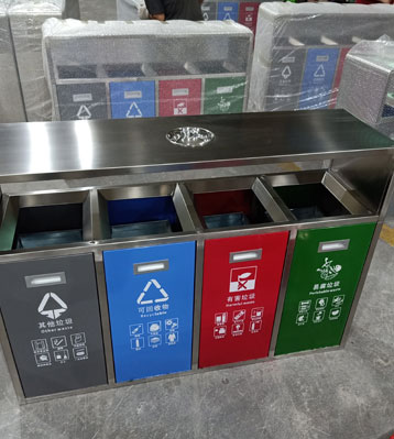 • 產品材質:戶外四分類垃圾箱根據客戶需求可采用201#,202#,304#優質不銹鋼材質模壓或焊接成型,面板可分色烤漆美觀耐用,不易破損;耐火安全,適合各種惡劣氣候條件;金屬亮澤,高雅美觀,廣泛適用于各種戶外場所;內外表面光潔,減少垃圾殘留,易于清潔;配置鍍鋅板內桶,便于垃圾清倒。