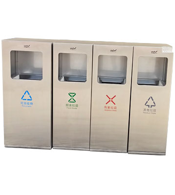 • 使用范圍:不銹鋼戶外四分類垃圾箱表面光滑、亮麗,是市政、企業、學校、小區、酒店、機場、汽車站等戶外分類垃圾收集擺放的首選。